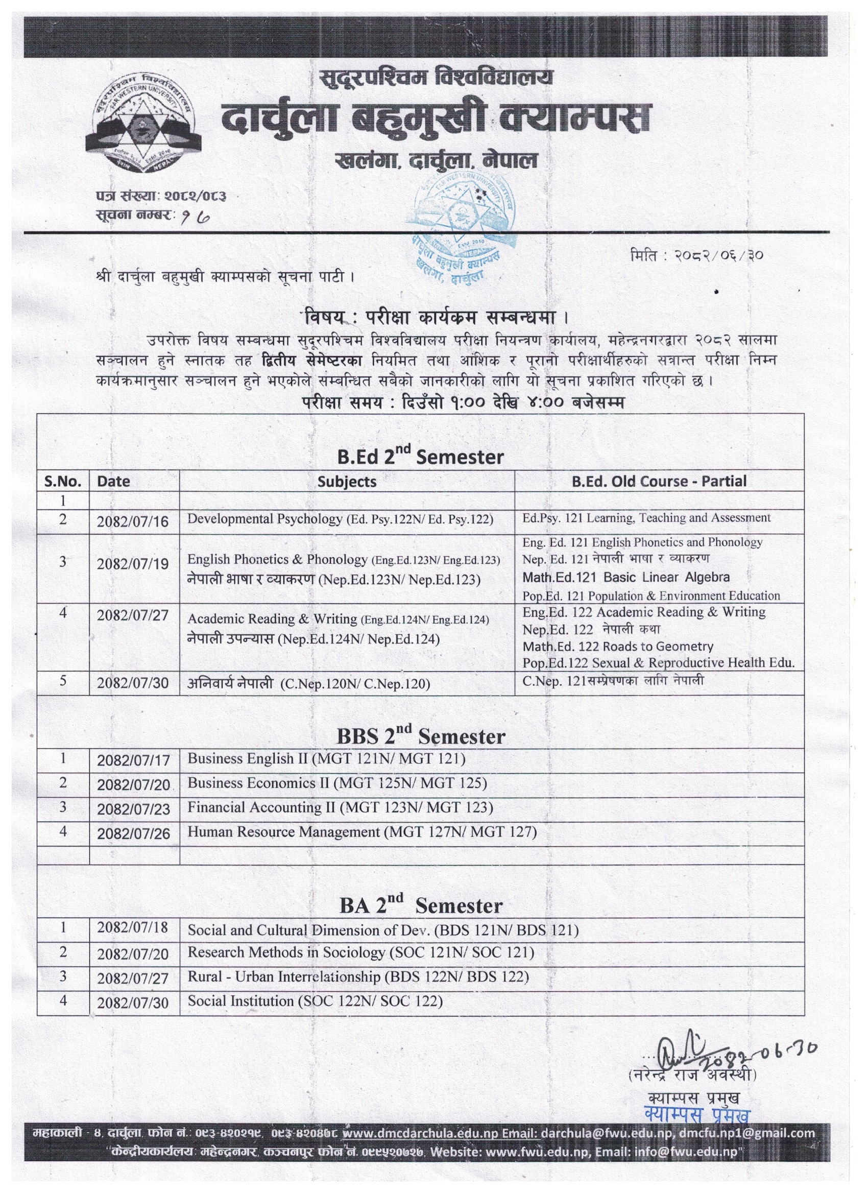 स्नातक तह दाेस्राे सेमेष्टरका नियमित तथा आंशिक (नयाँ र पुरानाे काेर्ष ) सत्रान्त परीक्षाकाे पूर्व प्रकाशित सूचना अनुसार स्थगन गरिएका परीक्षा निम्न कार्यक्रम अनुसार सञ्चालनका गरिने भएकाेले सम्बन्धित सबैकाे जानकारीका लागि याे सूचना प्रकाशित गरिएकाे छ ।