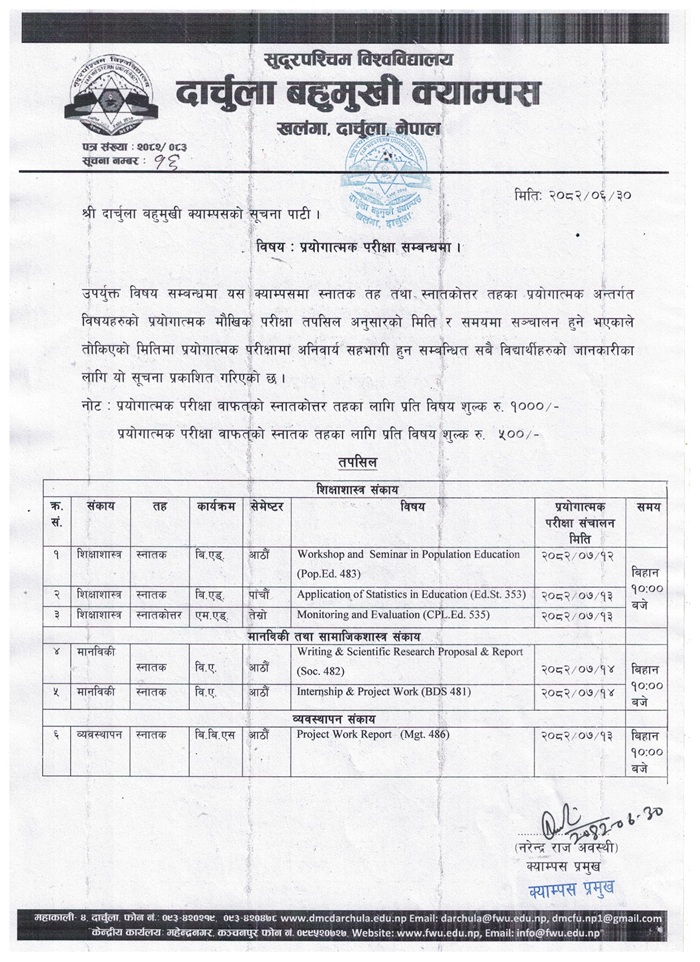 स्नातक तह दाेस्राे सेमेष्टरका नियमित तथा आंशिक (नयाँ र पुरानाे काेर्ष ) सत्रान्त परीक्षाकाे पूर्व प्रकाशित सूचना अनुसार स्थगन गरिएका परीक्षा निम्न कार्यक्रम अनुसार सञ्चालनका गरिने भएकाेले सम्बन्धित सबैकाे जानकारीका लागि याे सूचना प्रकाशित गरिएकाे छ ।