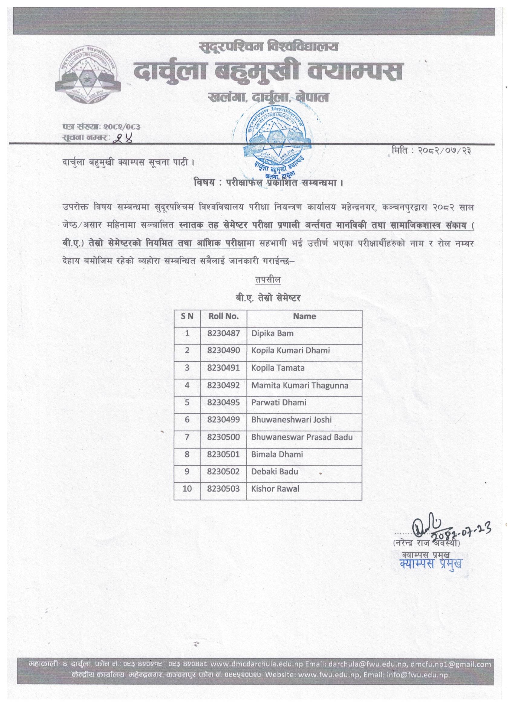 स्नातक तह मानविकी तथा सामाजिकशास्त्र सङ्काय (बी. ए.) तेस्राे सेमेष्टरकाे परीक्षाफल प्रकाशित सम्बन्धी सूचना ।