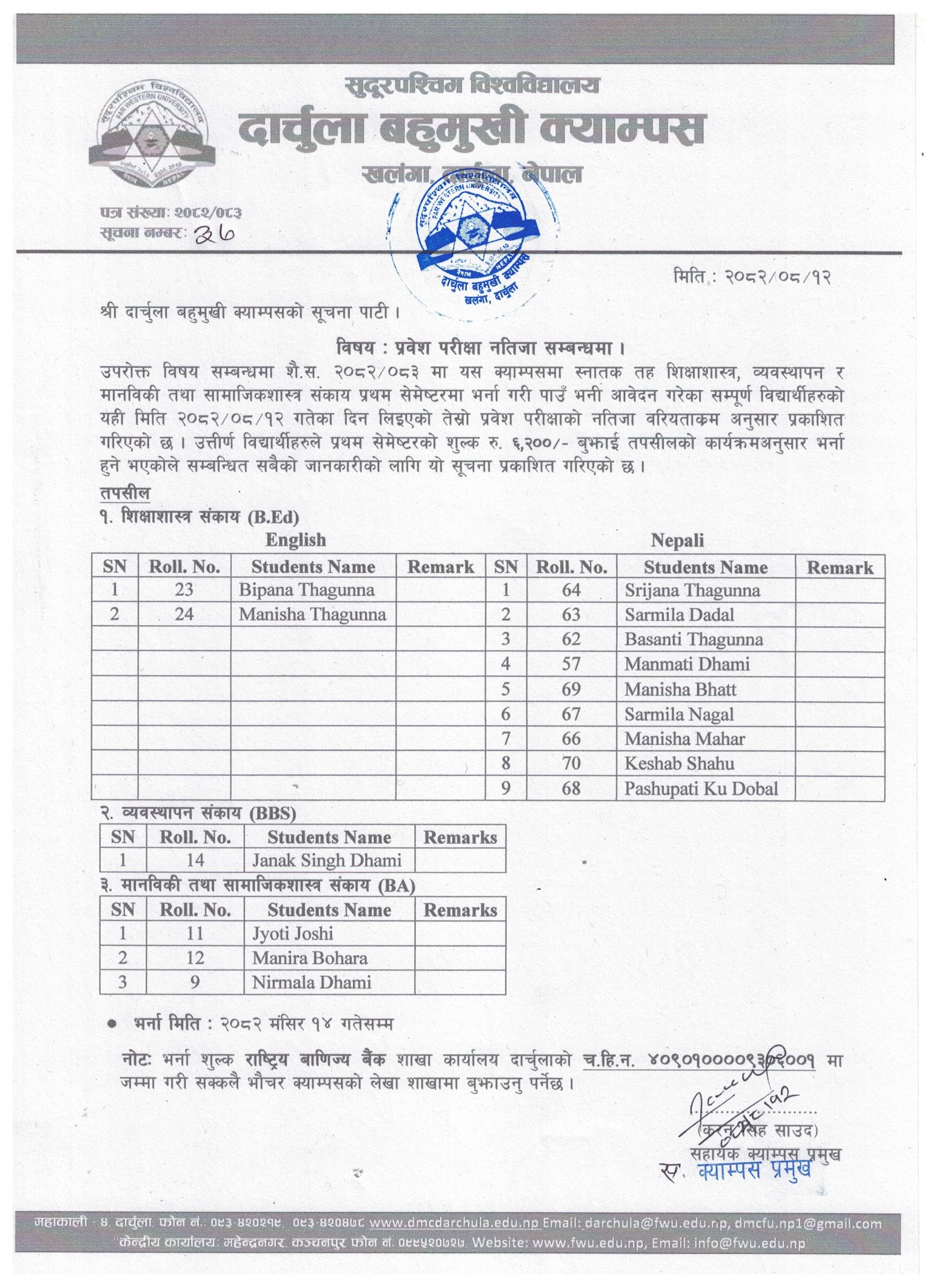 बि.ए. दाेस्राे प्रवेश परीक्षा नतिजा प्रकाशन सम्बन्धमा ।
