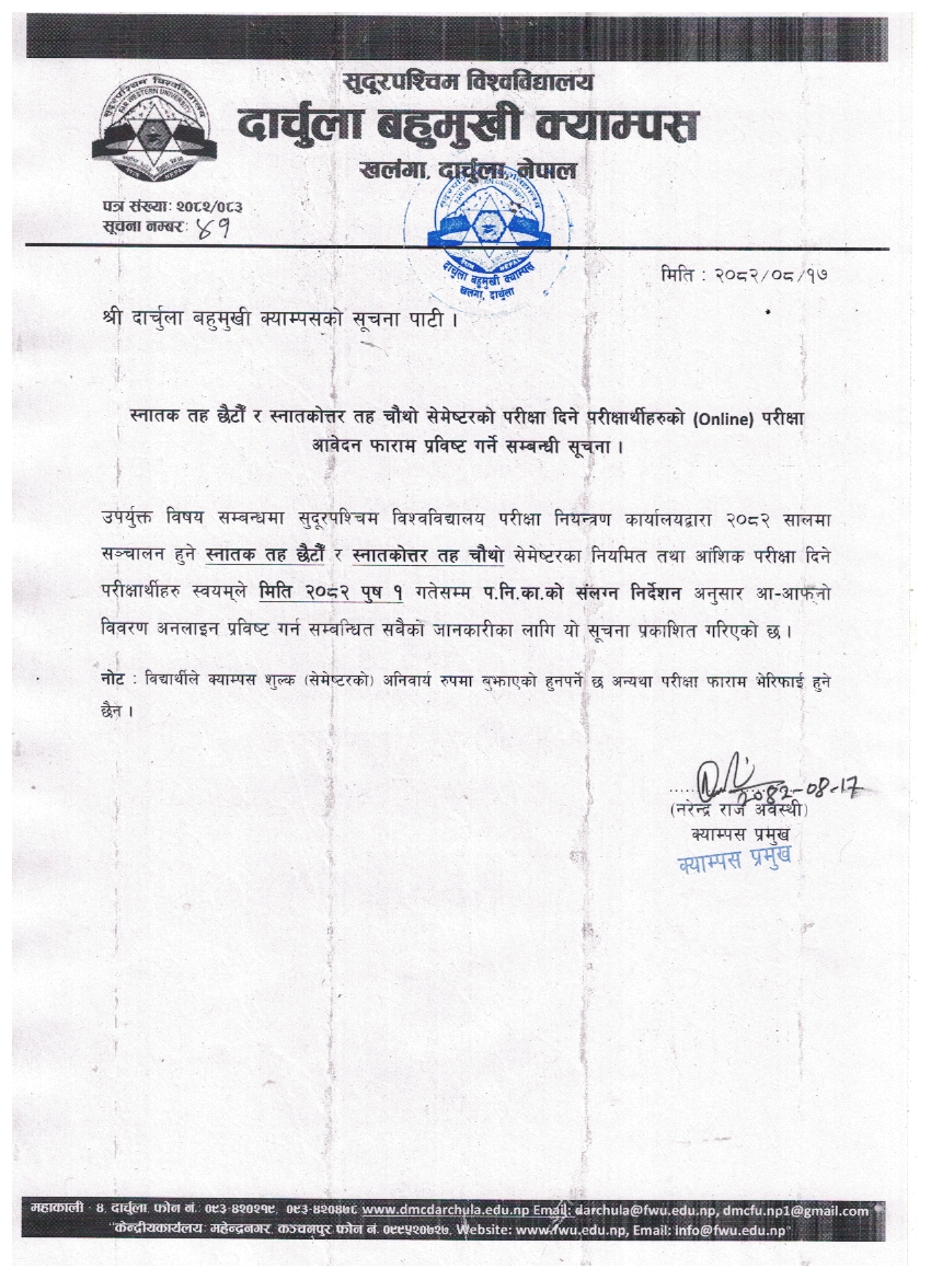 स्नातक तह छैटाैँ र स्नातकाेत्तर तह चाैथाे सेमेष्टरकाे परीक्षा आवेदन फाराम अनलाइन प्रविष्ट गर्ने सम्बन्धी सूचना ।