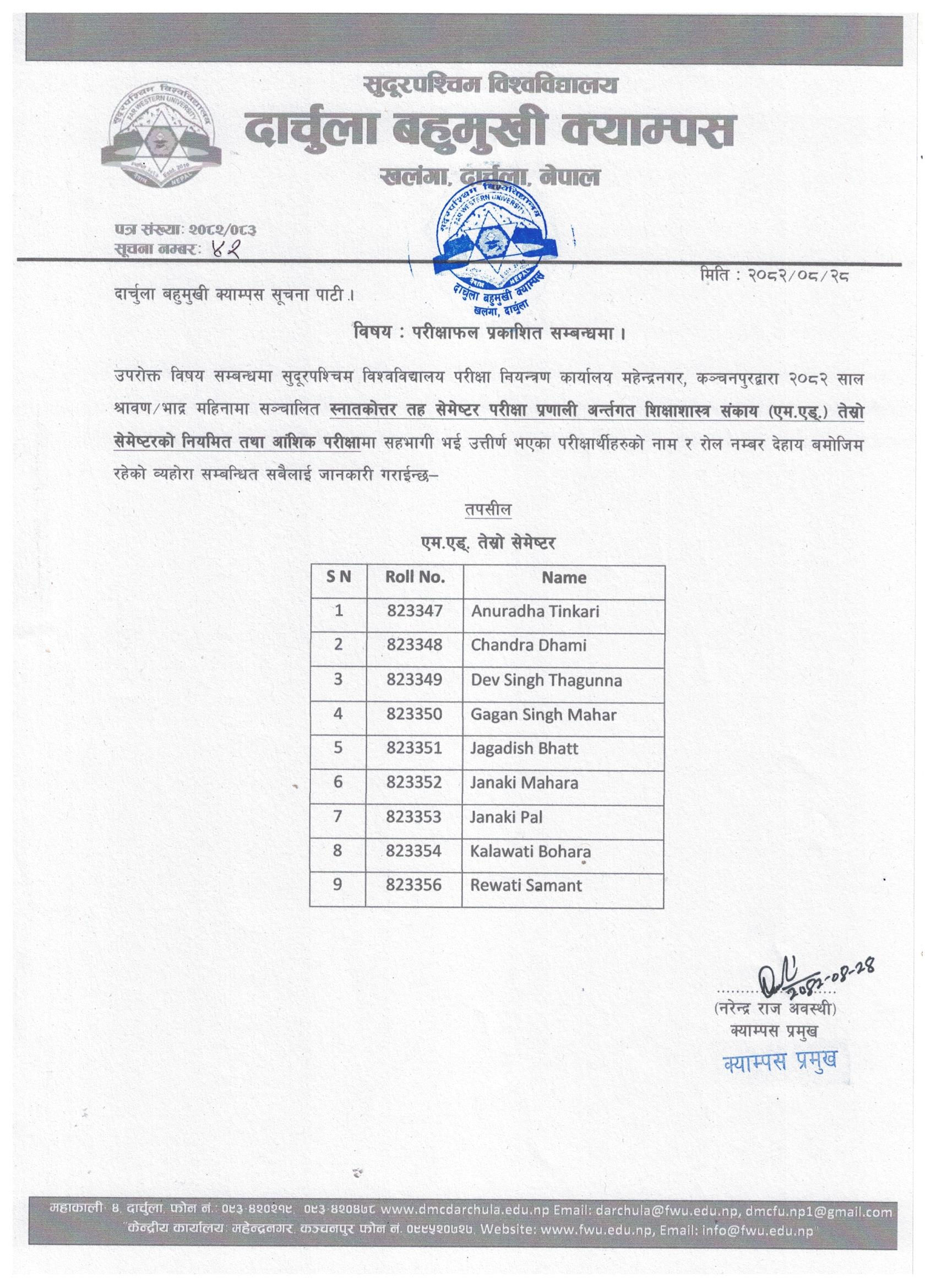 स्नातकाेत्तर तह शिक्षाशास्त्र सङ्काय (एम एड्.) तेस्राे सेमेस्टरकाे परीक्षाफल प्रकाशित सम्बन्धी सूचना ।