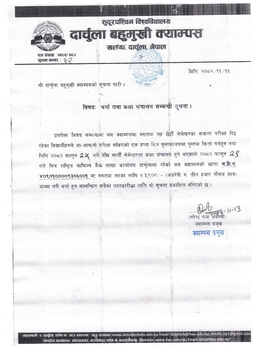 स्नातक तह साताैँ सेमेष्टरमा भर्ना तथा कक्षा सञ्चालन सम्बन्धी सूचना ।