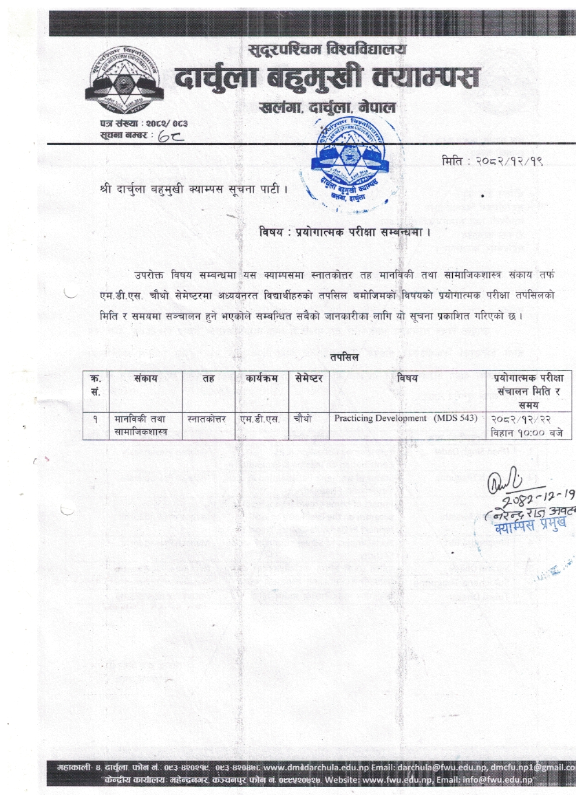 स्नातकाेत्तर तह चाैथाे सेमेष्टरकाे प्रयाेगात्मक परीक्षा सम्बन्धी सूचना ।